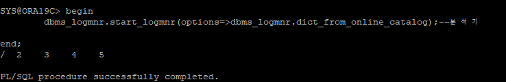 dbms_logmnr.start_logmnr(options=>dbms_logmnr.dict_from_online_catalog);--분석기