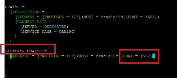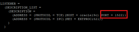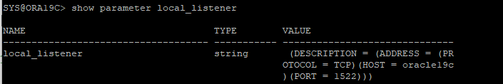 ALTER SYSTEM SET local_listener = '(DESCRIPTION = (ADDRESS = (PROTOCOL = TCP)(HOST = oracle19c)(PORT = 1522)))';