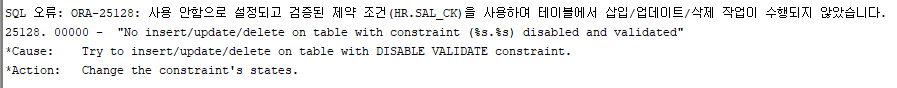 ALTER TABLE hr.test ADD CONSTRAINT sal_ck CHECK(sal > 0) DISABLE VALIDATE; -- DISABLE VALIDATE은 DML을 막아버린다.