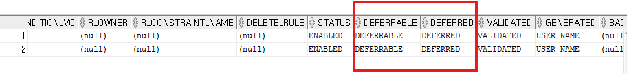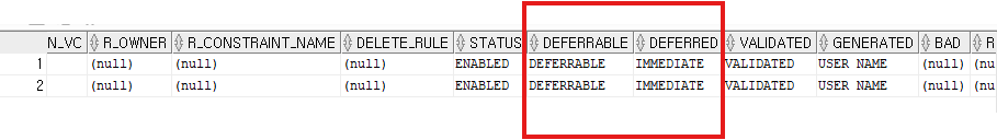 - NOT DEFERRABLE로 설정하면 DEFERRABLE 컬럼값이 NOT DEFERRABLE로 되고 INITIALLY IMMEDIATE로 설정하면 DEFERRED 컬럼값이 IMMEDIATE로 된다.