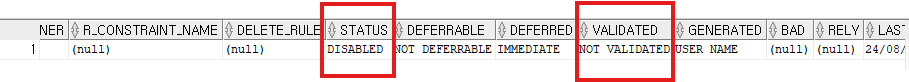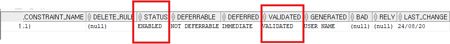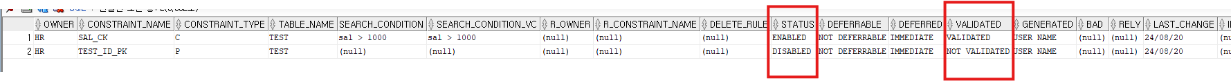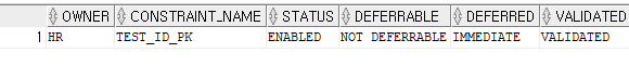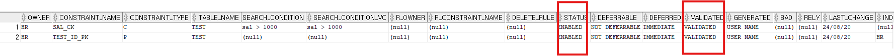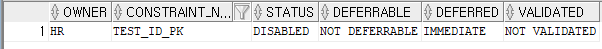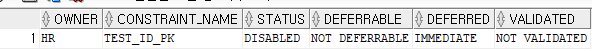 SELECT owner,constraint_name, status,deferrable,deferred,validated FROM dba_constraints WHERE owner = 'HR' AND table_name = 'TEST';