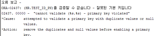 - PRIMARY KEY 제약조건을 위반하고 데이터를 INSERT 하였기 때문에 PK제약조건은 DISABLE NOVALIDATE로 변경되었다