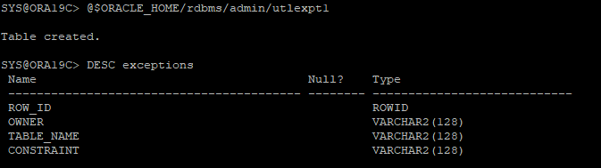 - local 서버에서 $ORACLE_HOME/rdbms/admin/utlexpt1 스크립트를 실행시켜 주면 exceptions 테이블이 자동으로 만들어진다.