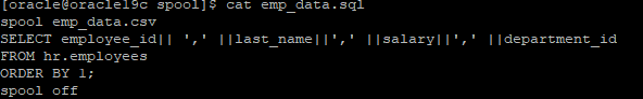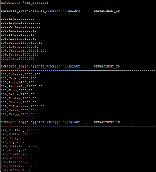 SELECT employee_id|| ',' ||last_name||',' ||salary||',' ||department_id