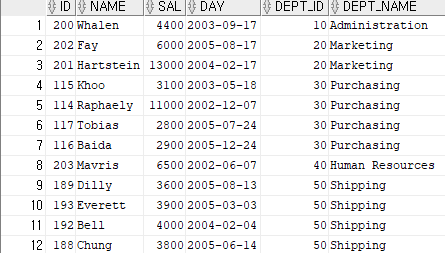 (id,name,sal,day date 'yyyy-mm-dd',dept_id,dept_name)