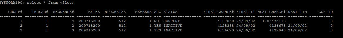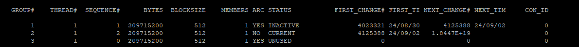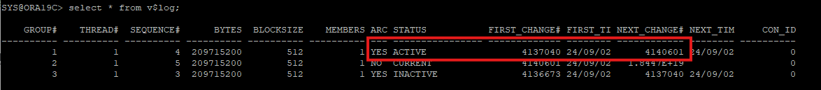 아카이브 설정 이전 redo log 파일의 ARCHIVED 컬럼은 YES로 표시된다.