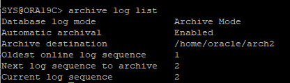 database log mode : archive log mode 확인Automatic archival : ARC 백그라운드 프로세스 사용 여부Archive destination : archive log 파일이 저장되는 위치Oldest online log sequence : 가장 오래된 시퀀스 번호Current log sequence : current한 시퀀스 번호