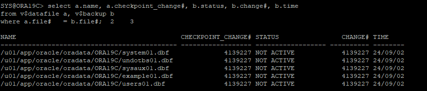 select a.name, a.checkpoint_change#, b.status. b.change#, b.time