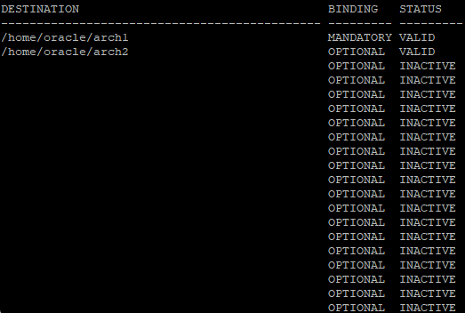 select destination, binding, status from v$archive_dest;