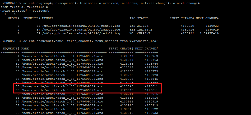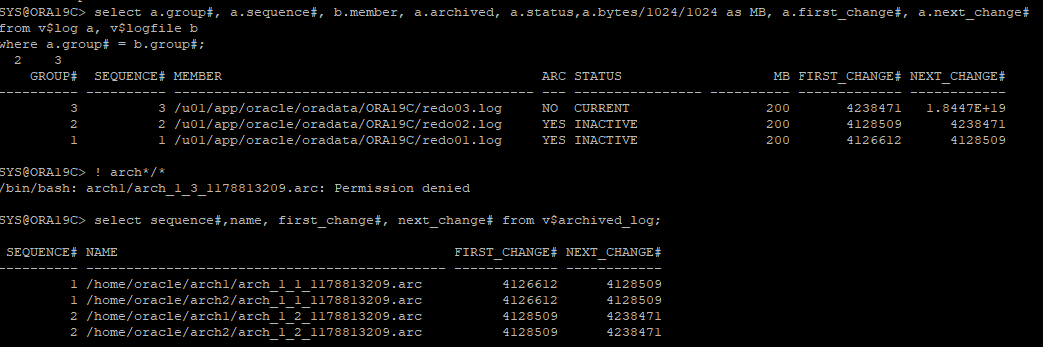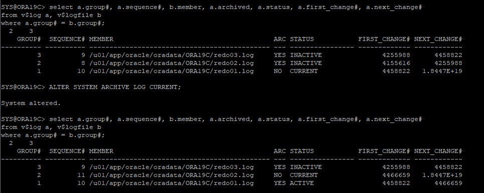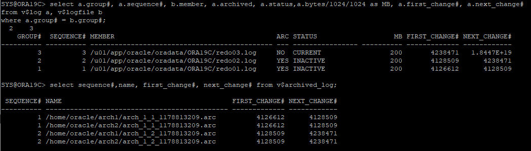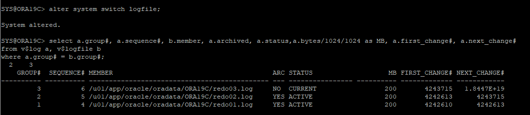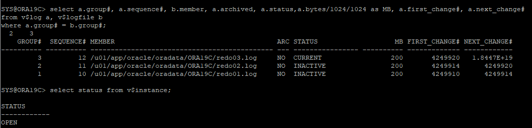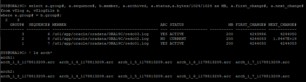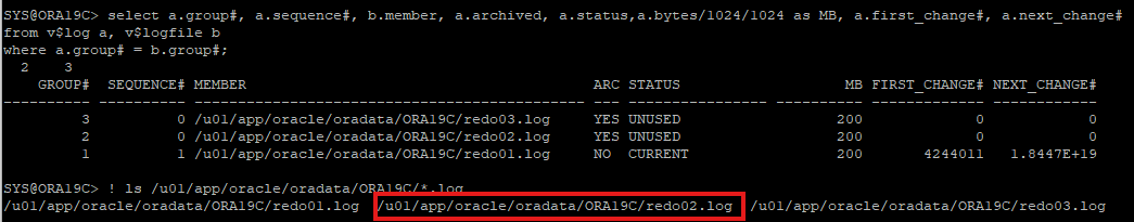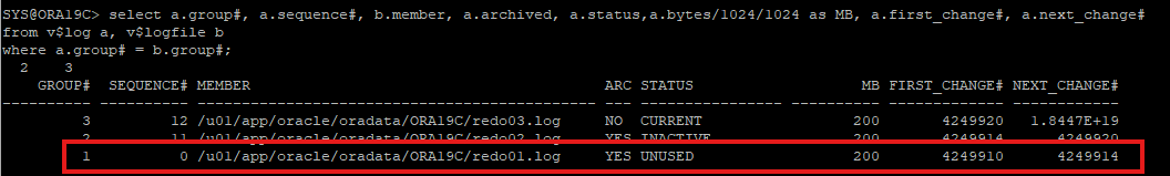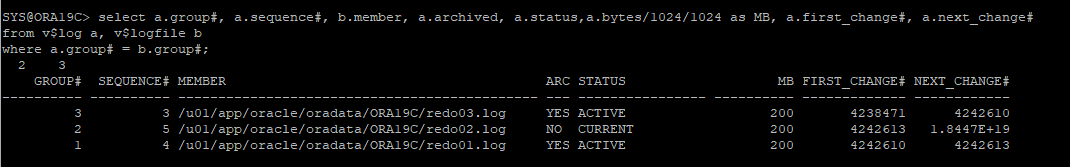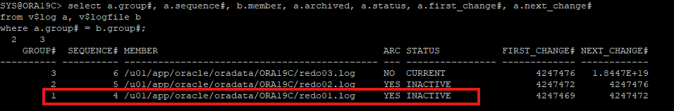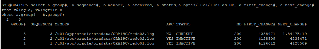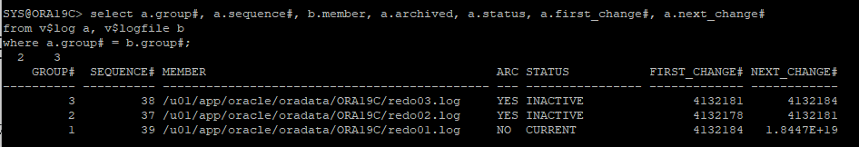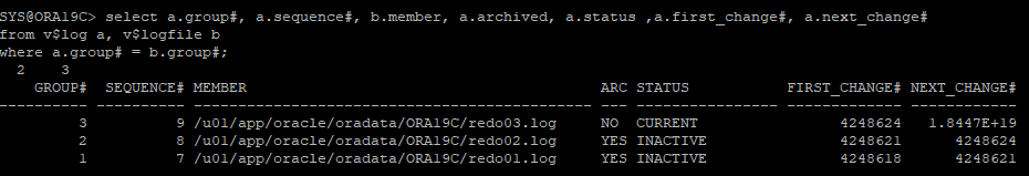 select a.group#,a.sequence#,b.member,a.status, first_change#, next_change#