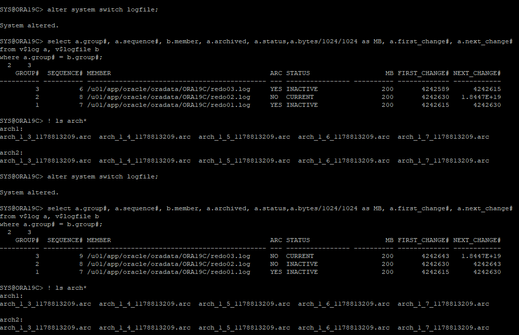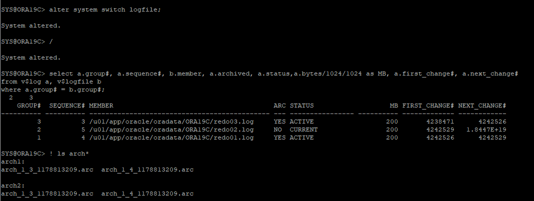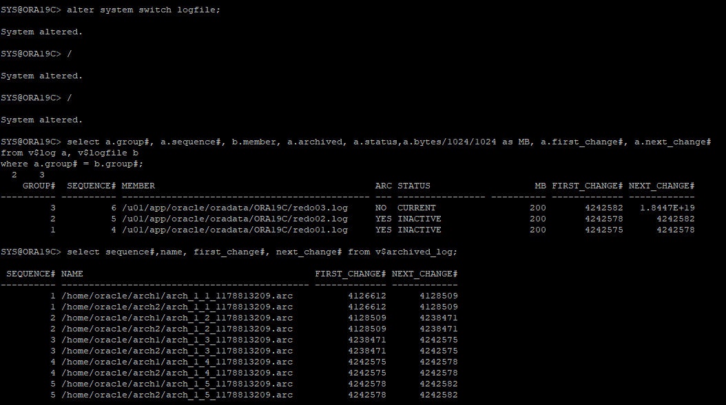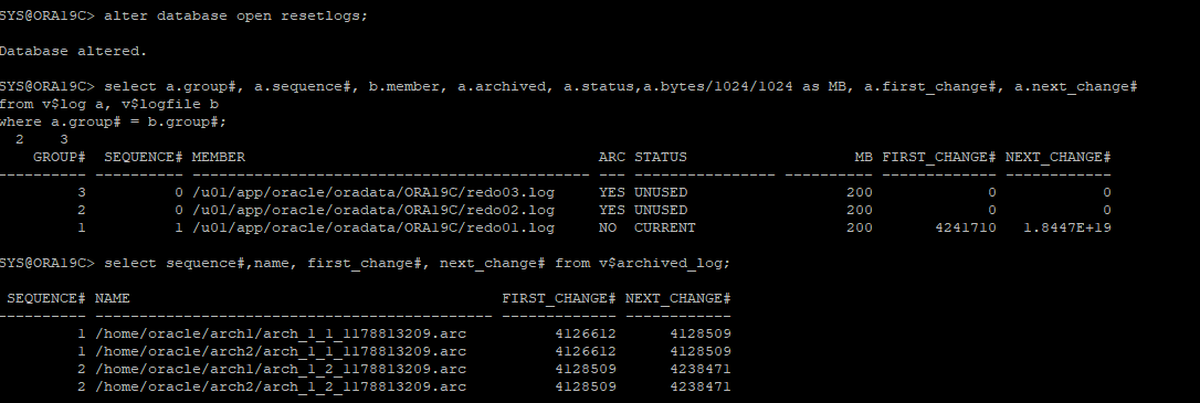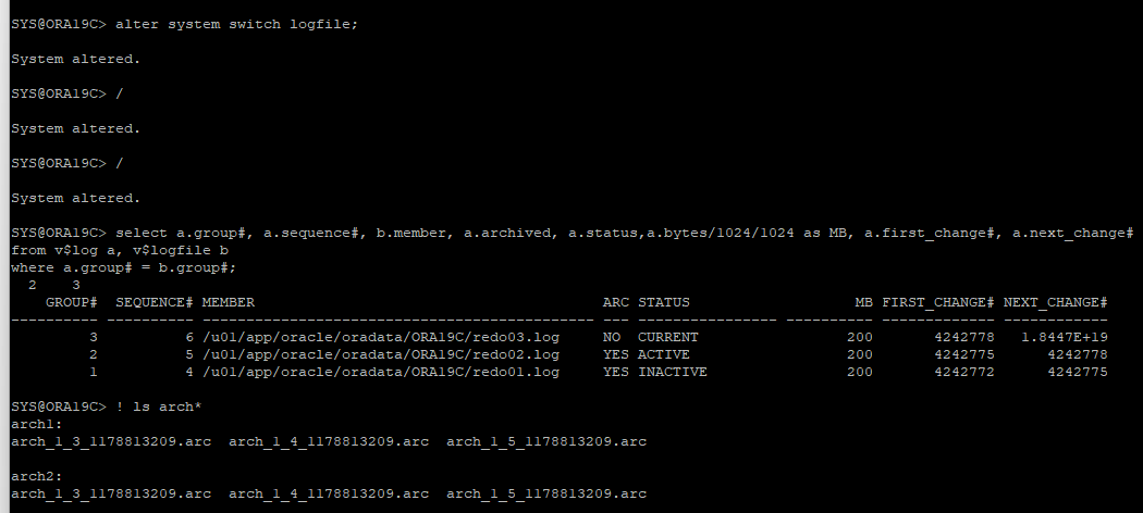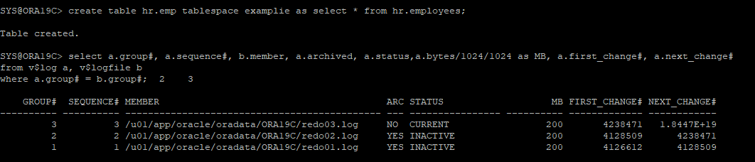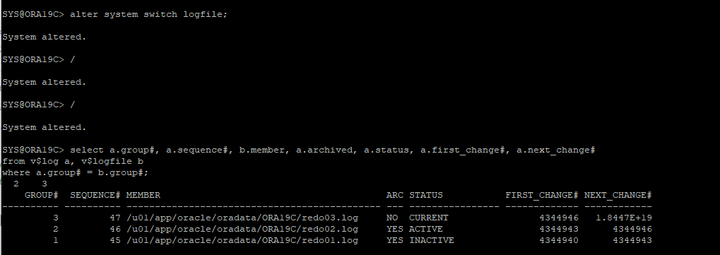 select a.group#,a.sequence#,b.member,a.status, first_change#, next_change#