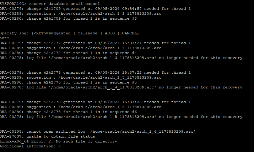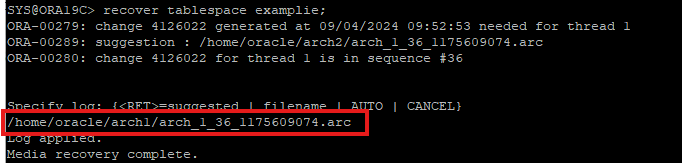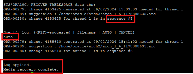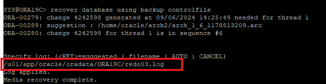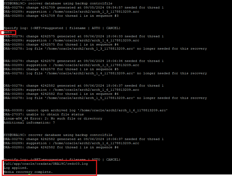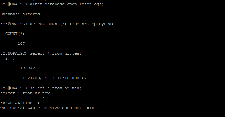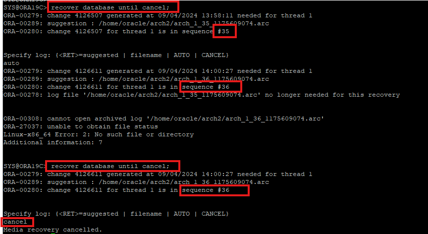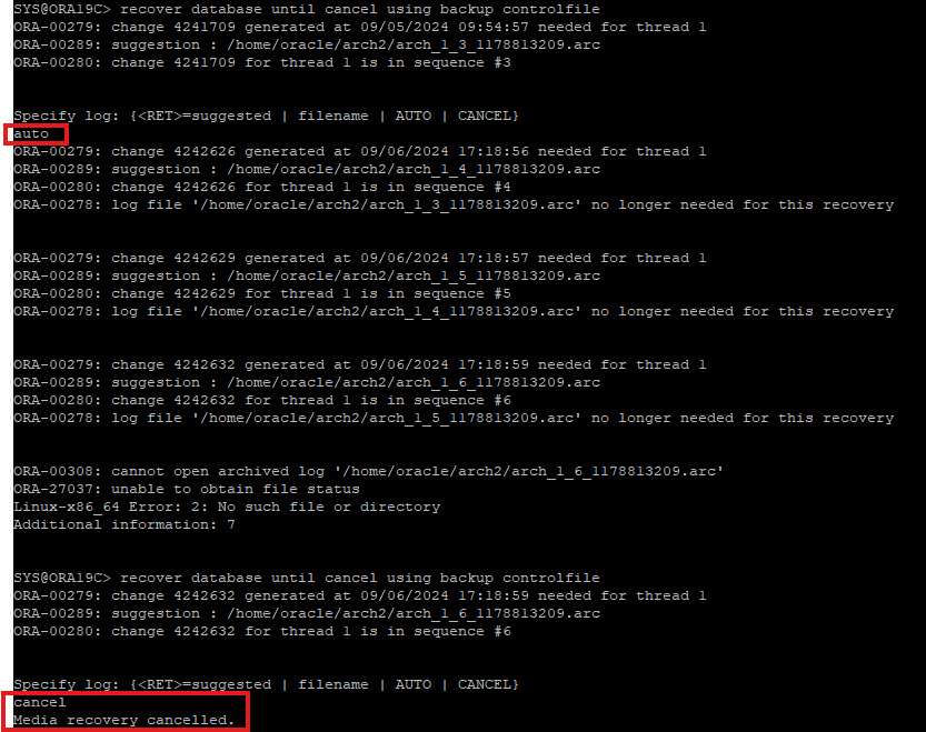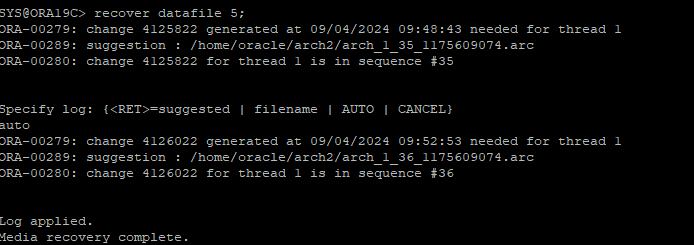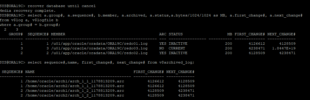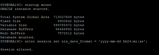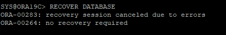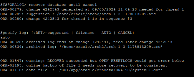 MOUNT 단계에서 RECOVER 할때는 ALTER DATABASE RECOVER 로 시작하고 DB OPEN 시점에는 RECVOER로만 하면 된다.