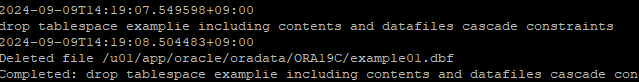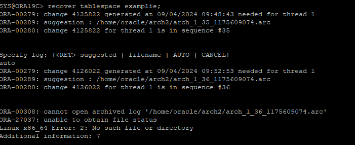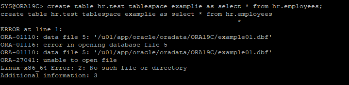 - examplie 테이블스페이스 데이터 파일이 존재하지 않기 때문에 오류발생