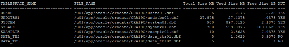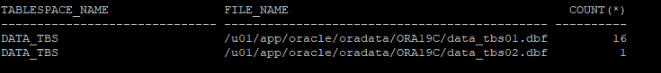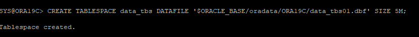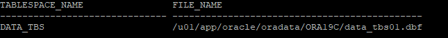 alter tablespace data_tbs add datafile '/u01/app/oracle/oradata/ORA19C/data_tbs02.dbf' size 5m;