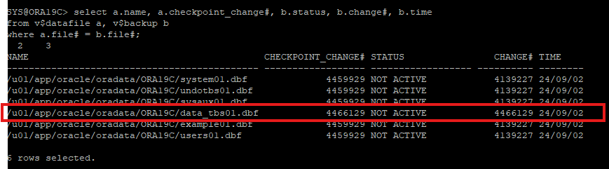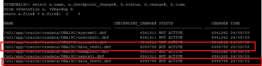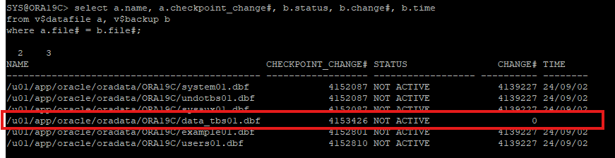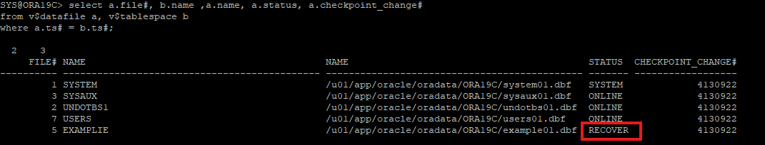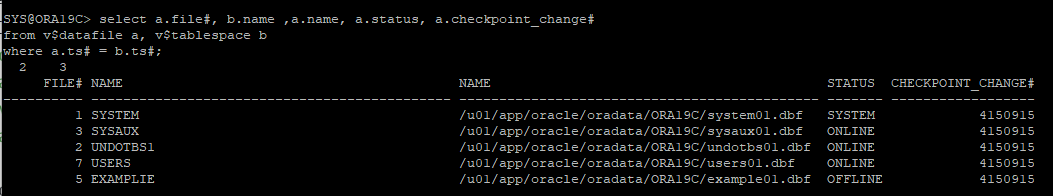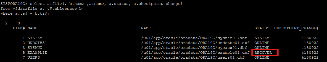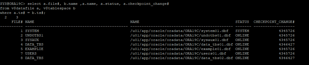 select a.file#, b.name ,a.name, a.status, a.checkpoint_change#