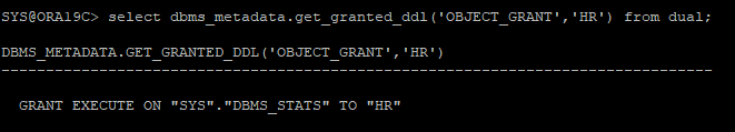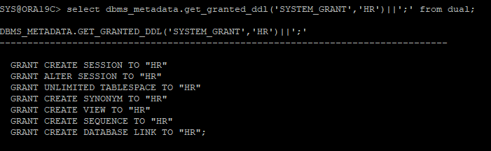 select dbms_metadata.get_granted_ddl('SYSTEM_GRANT','HR') from dual;