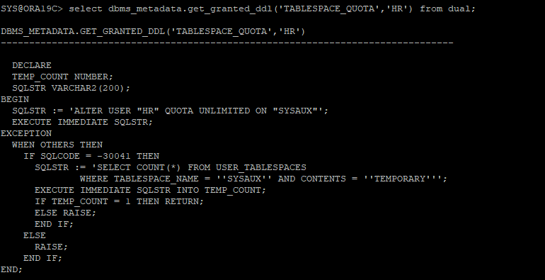 select dbms_metadata.get_granted_ddl('TABLESPACE_QUOTA','HR') from dual;