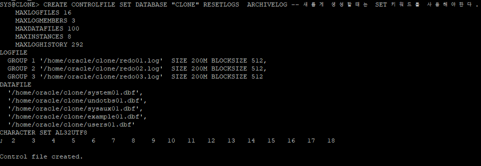CREATE CONTROLFILE SET DATABASE "CLONE" RESETLOGS ARCHIVELOG -- 새롭게 생성할때는 SET 키워드를 사용해야한다.