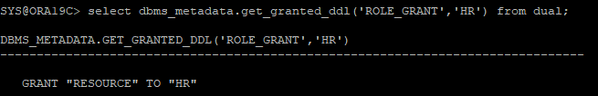 select dbms_metadata.get_granted_ddl('ROLE_GRANT','HR') from dual;