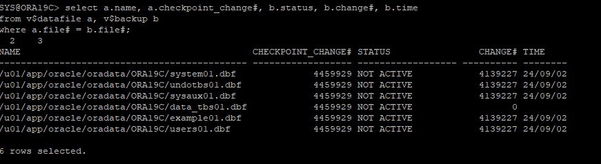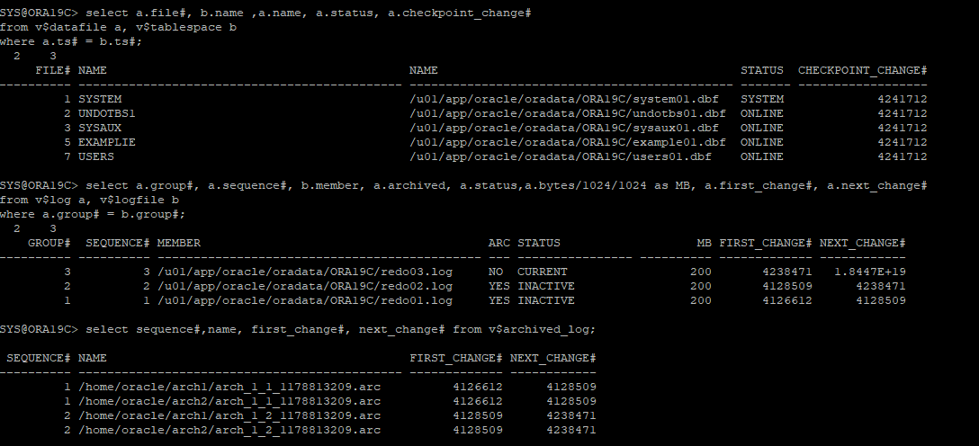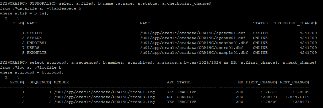select a.name, a.checkpoint_change#, b.status, b.change#, b.time