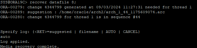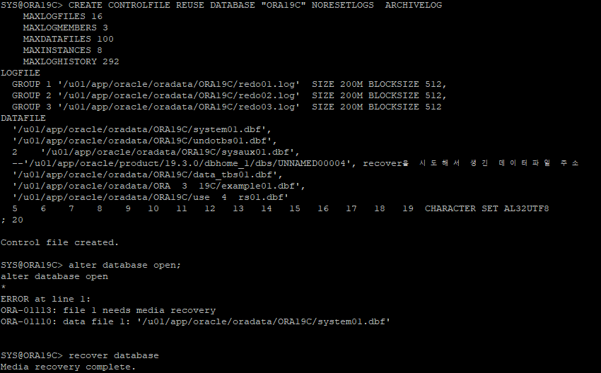 - 데이터파일 하나하나 recover 하기 싫을때는 전체 database를 recover 해주면 된다.