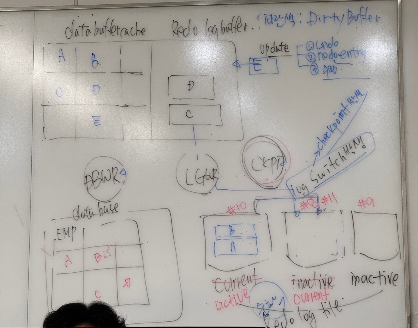 그럼 CKPT는 active 상태의 그룹을 보고 변경된 블록을 알수 있어 DBWR에 시그널을 보낸다.
