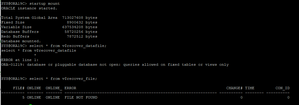DB를 다시 MOUNT 단계까지 실행하고 recover file 뷰로 확인