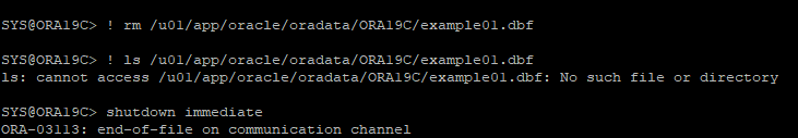 sql "alter database rename file ''/u01/app/oracle/oradata/ORA19C/redo01.log'' to ''/home/oracle/oradata/redo01.log''";