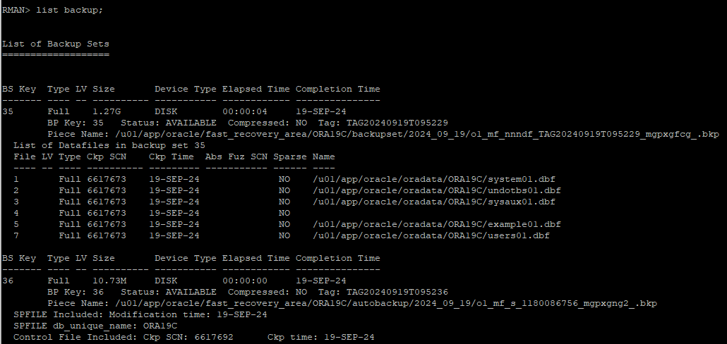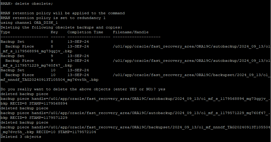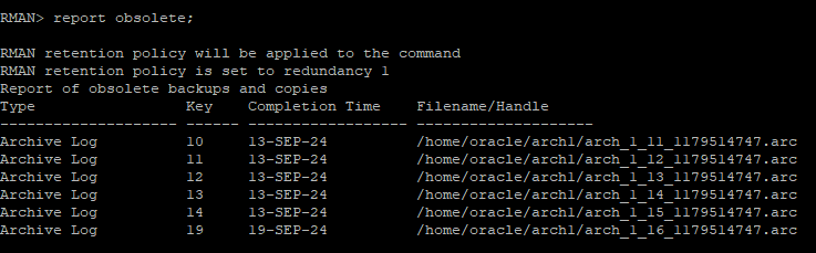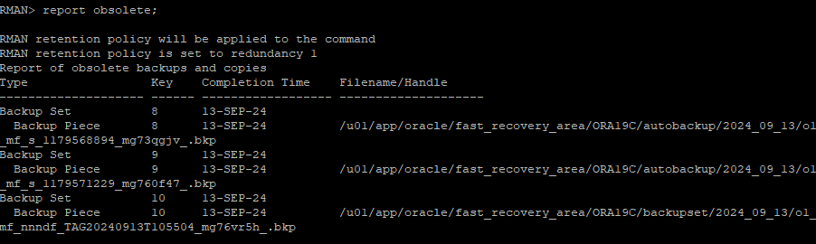 control 파일에 변경사항이 생겨 자동으로 새롭게 백업이 되었다. rman 에서 정책상 필요없는 백업정보를 확인해보면 이전 control file 백업본이 조회된다.
