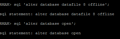 --sql 'alter tablespace insa_tbs offline immediate'; 우리는 이미 이전에 문제있는 데이터파일을 offline 모드로 변경하였기 때문에 수행하지 않는다.