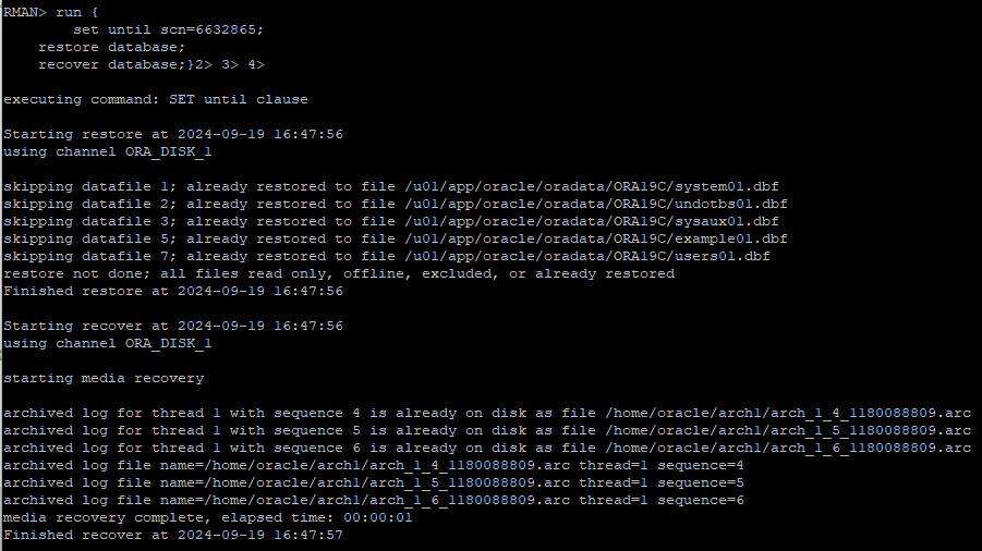 export NLS_DATE_FORMAT='yyyy-mm-dd hh24:mi:ss' 설정백업파일의 scn을 확인후 몇번 시퀀스의 아카이브로그파일부터 필요하지 확인