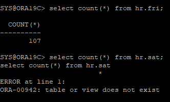 복구 데이터를 확인해보면 아카이브로그파일에 저장되어있던 fri 테이블은 살아있지만 current한 리두로그에 저장되어있던 sat 테이블은 손실된걸 확인 할 수 있다.