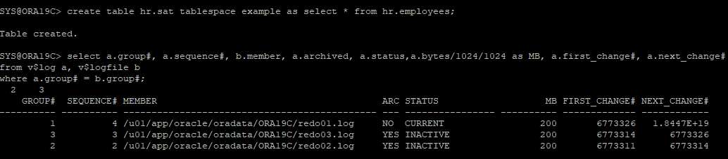 테이블 생성 후 로그스위치 발생으로 아카이브로그 파일 생성