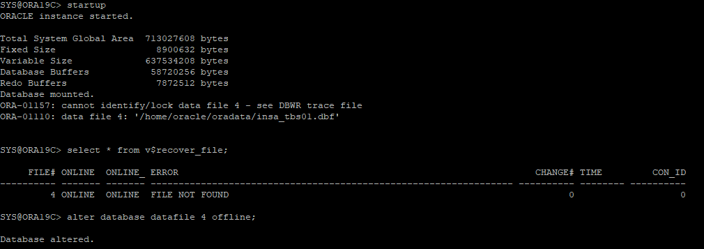 startup 하지만 손상된 데이터파일이 있기 때문에 open 되지않는다. 하지만 다른 업무들은 수행해야 하기 때문에 문제있는 데이터파일만 offline 으로 변경 후 DB OPEN