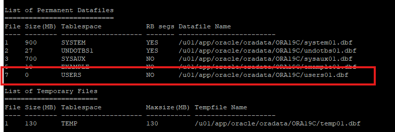 rman 에서 controlfile의 정보를 확인해보면 user 데이터파일은 없기 때문에 사이즈가 0으로 조회된다.
