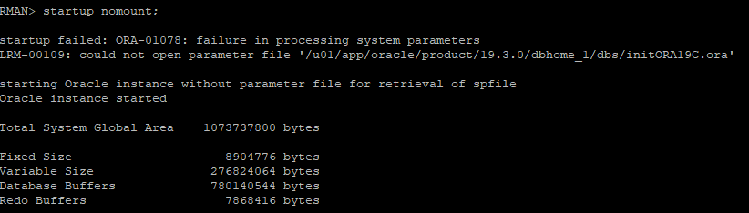 RMAN 에서는 초기파라미터 파일이 없지만 RMAN에서 제공하는 샘플 메모리를 이용해서 nomount 단계까지는 실행 가능하다.