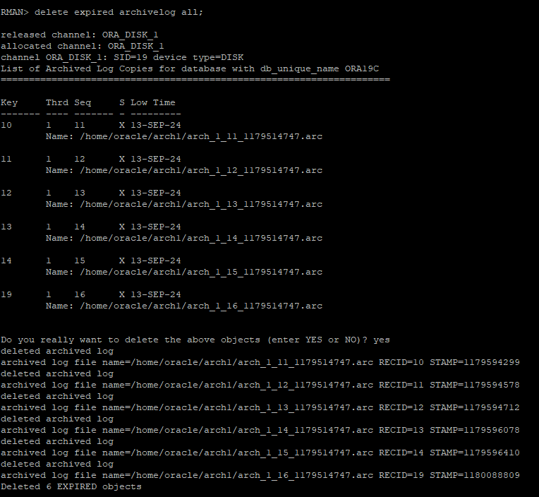 delete expired archivelog all;