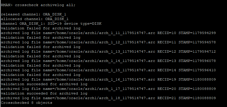crosscheck archivelog all;