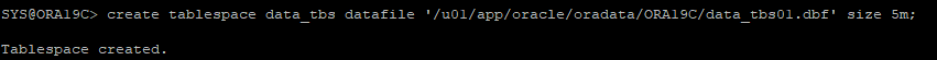 alter tablespace data_tbs add datafile '/u01/app/oracle/oradata/ORA19C/data_tbs02.dbf' size 5m;