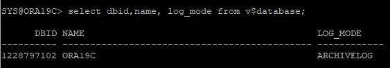 select dbid,name, log_mode from v$database;