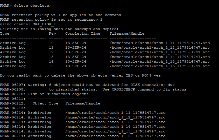 - 삭제를 진행하다 보면 control파일이 가지고 있는 논리적인 archive 정보와 물리적인 archive 정보가 맞지 않아 경고가 발생한다.