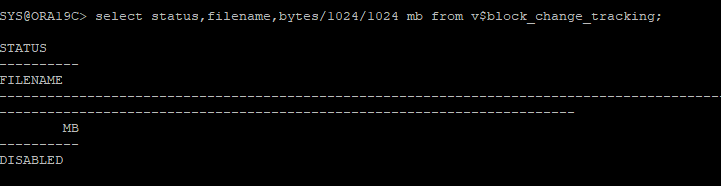 select status,filename,bytes/1024/1024 mb from v$block_change_tracking;