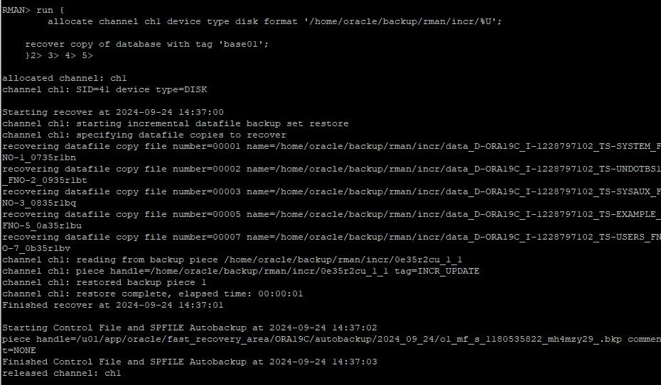 rman통해 incremental 레벨로 받은 백업본을 이용해서 복구를 진행할때 처음 restore 할때는 0 level로 되어있는 full backup본만 먼저 restore 한뒤 recover 시에 그 후 level의 백업본을 restore 한뒤 redo를 적용해서 recover을 진행한다.
