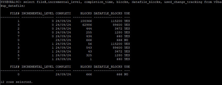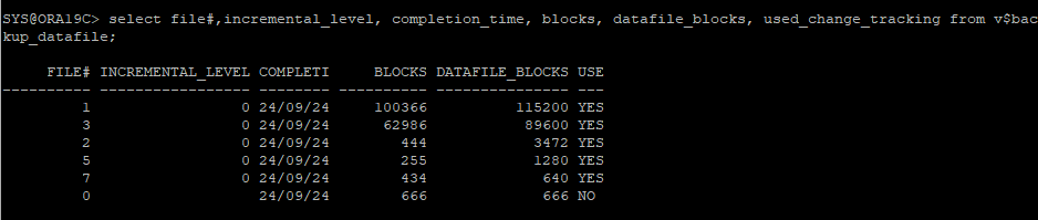 select file#,incremental_level, completion_time, blocks, datafile_blocks, used_change_tracking