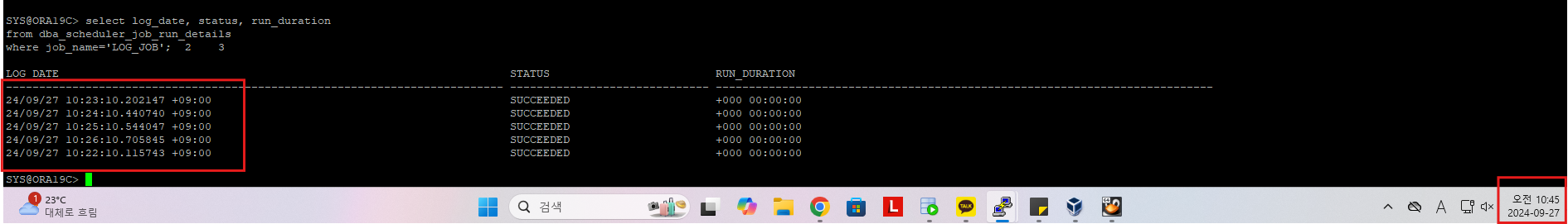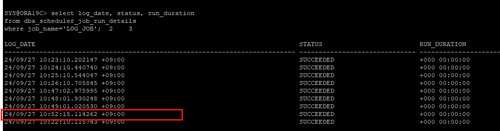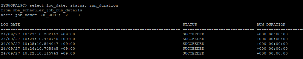 execute dbms_scheduler.purge_log(log_history=>1, job_name=>'log_job');: 1일 이전의 기록이 삭제된다.