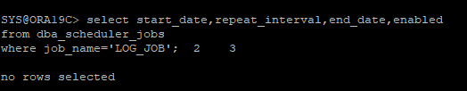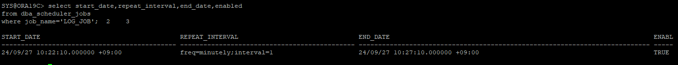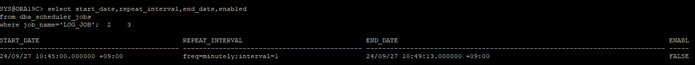 enabled=> false); -- false로 되어있기 때문에 start 시간이 되어도 수행되지는 않는다.