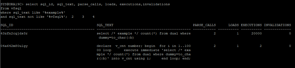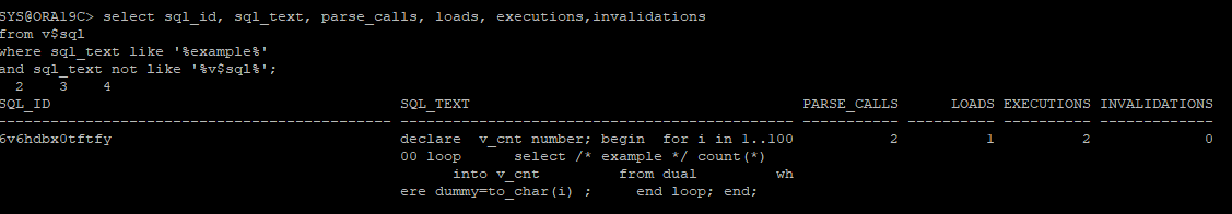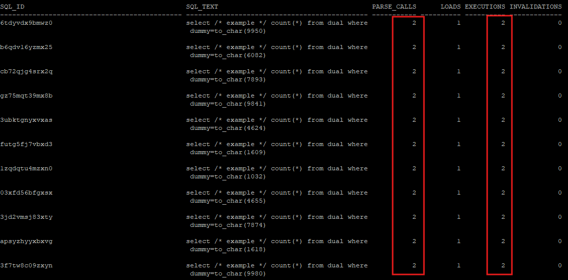 select sql_id, sql_text, parse_calls, loads, executions,invalidations