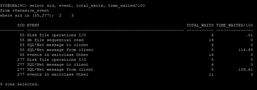 select sid, event, total_waits, time_waited/100