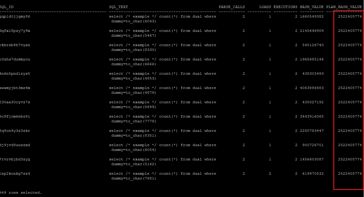 latch shared pool wait event가 발생하는걸 확인할 수있다. cursor : pin S wait on X : library cache pin을 shared 모드로 갖고 싶은데 다른 세션에서 exclusive 모드로 가지고 있어 기다리는 상황select sql_id, sql_text, parse_calls, loads, executions,hash_value, plan_hash_value