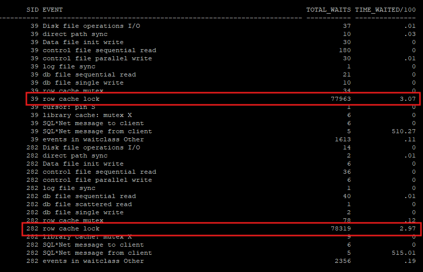 and w.saddr=(select saddr from v$session where event='row cache lock' and rownum=1)